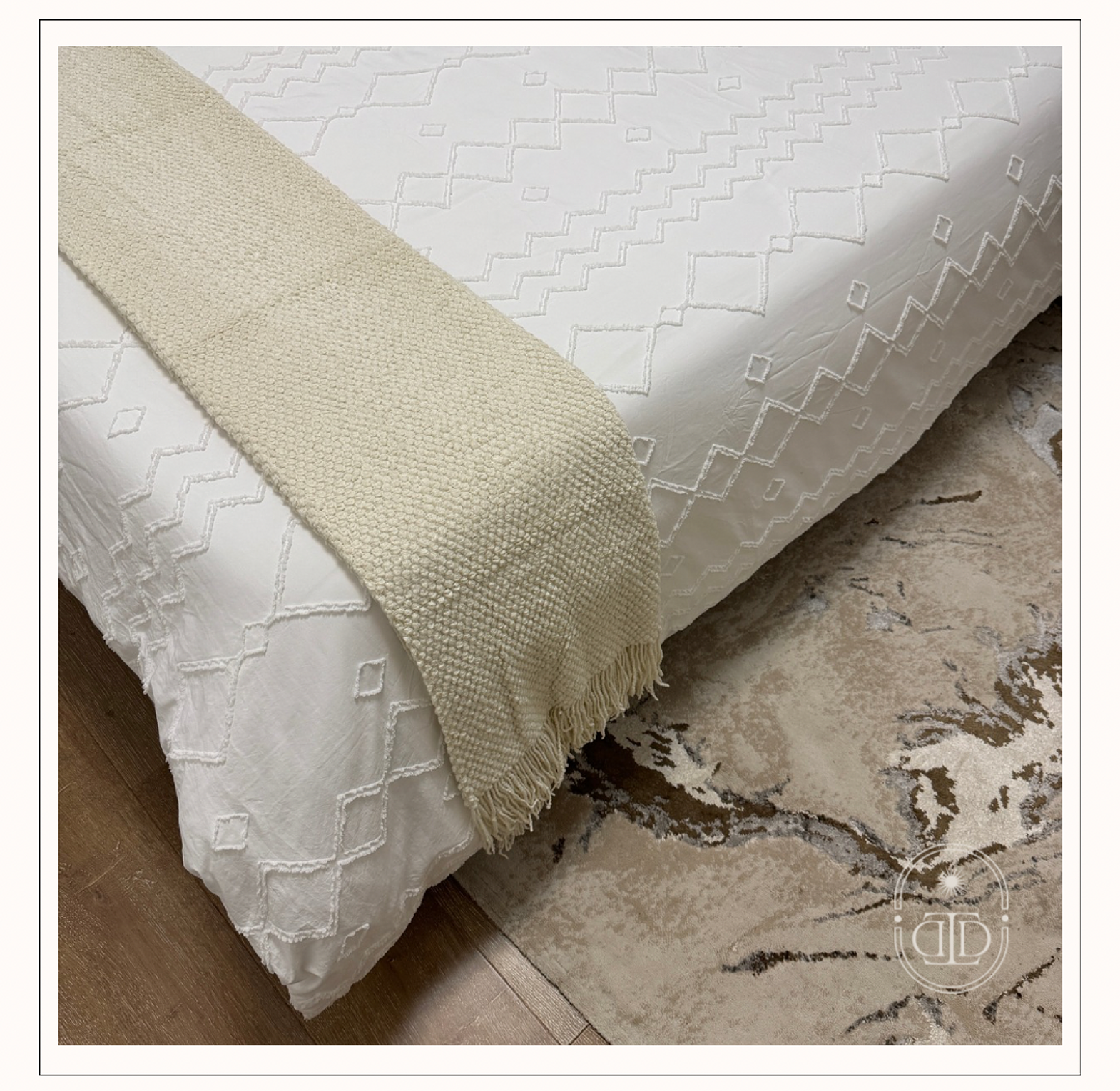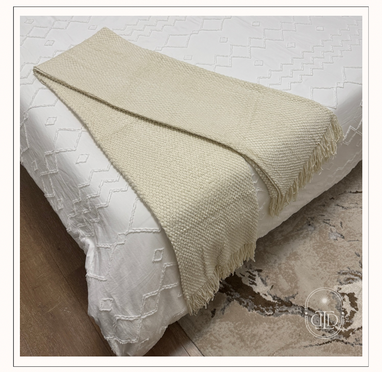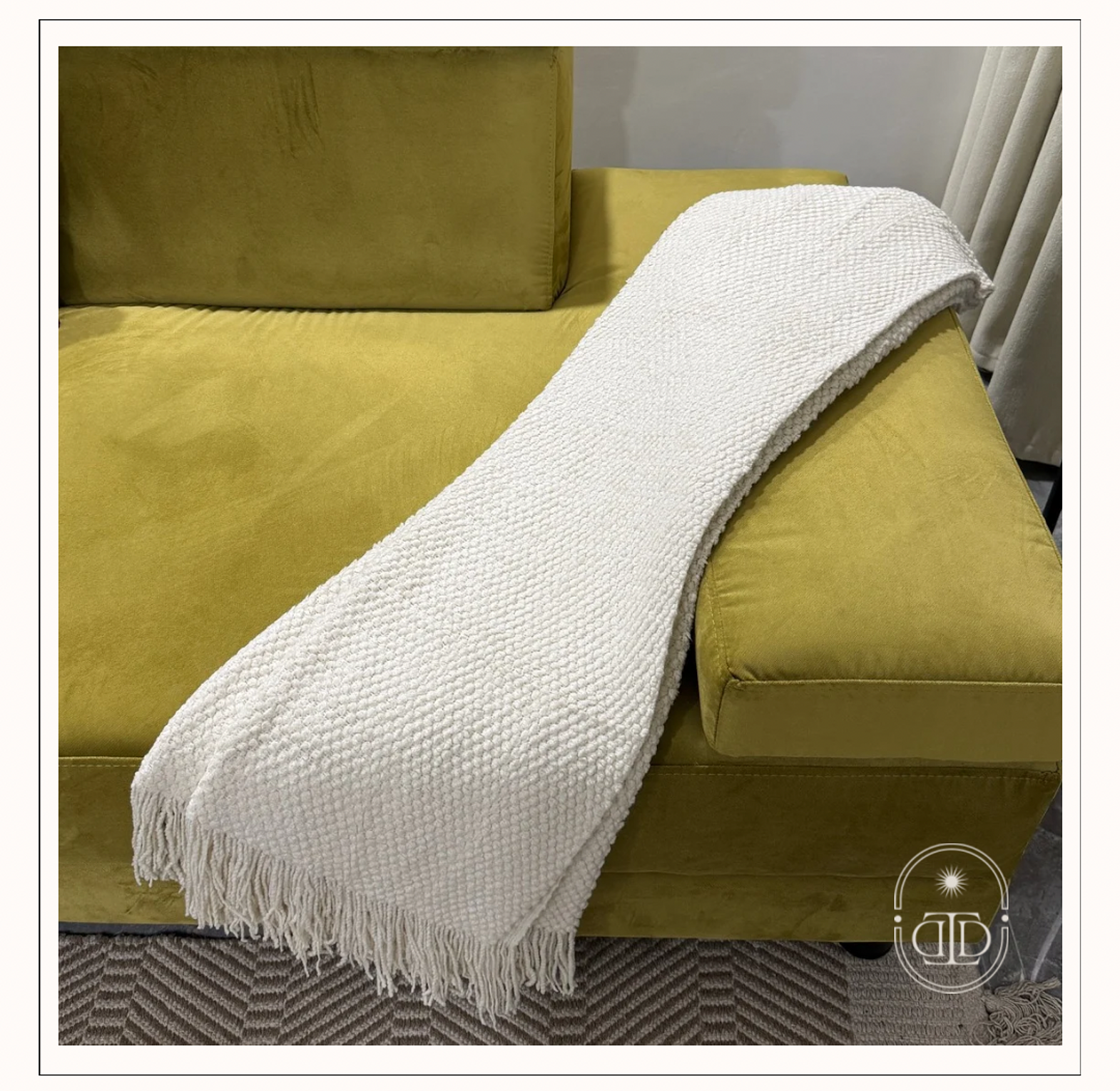 A soft beige throw blanket with tassel ends, perfect for adding warmth and understated elegance to any sofa or bed.
