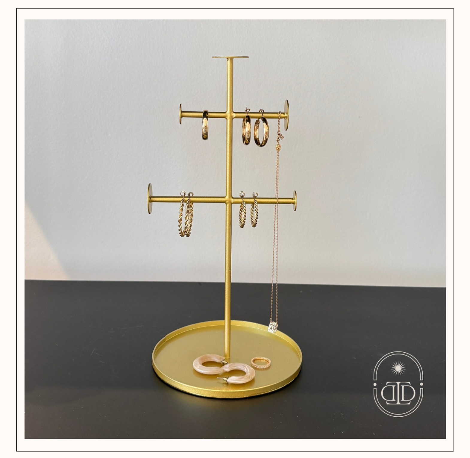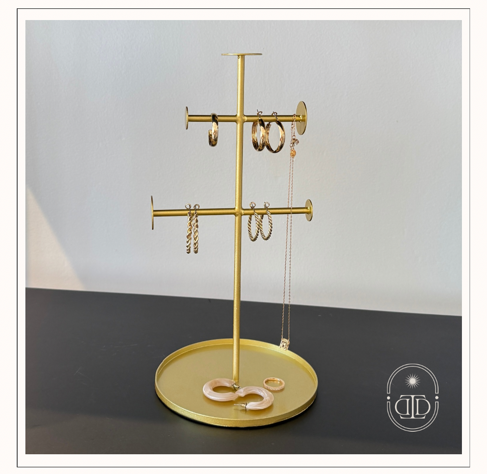 Organize your jewelry in style with this gold-finish holder, featuring elongated sides for hanging earrings and necklaces, plus a flat base for extra storage