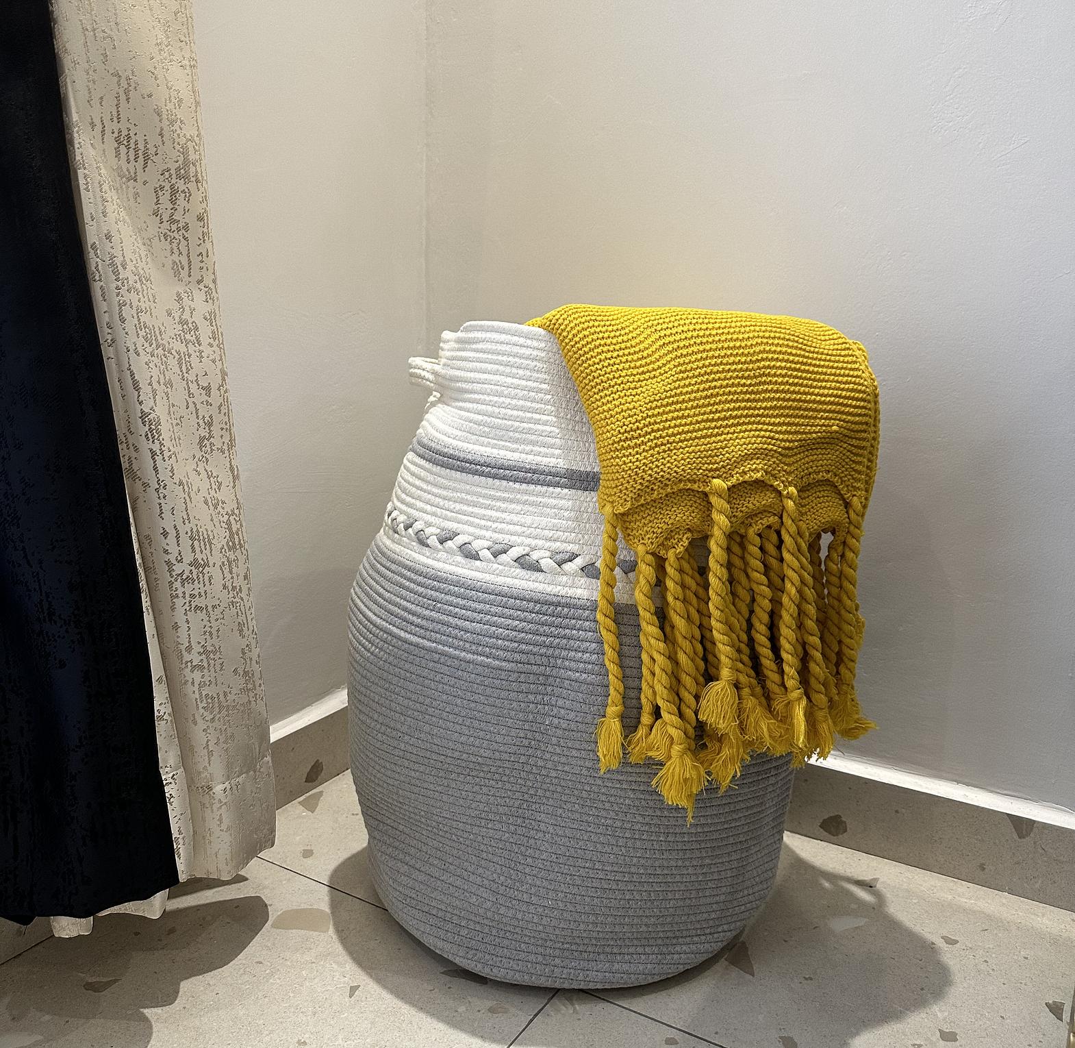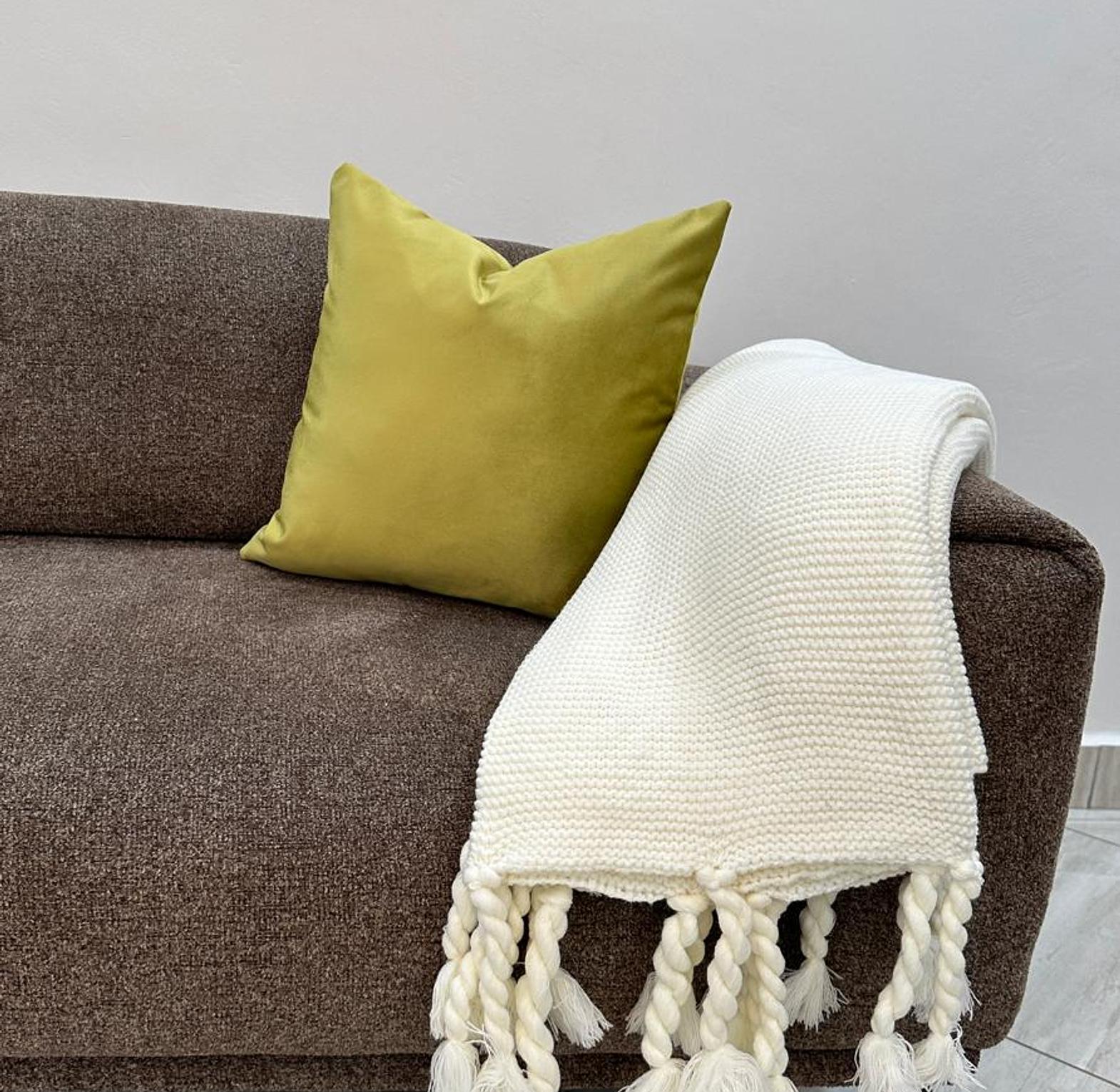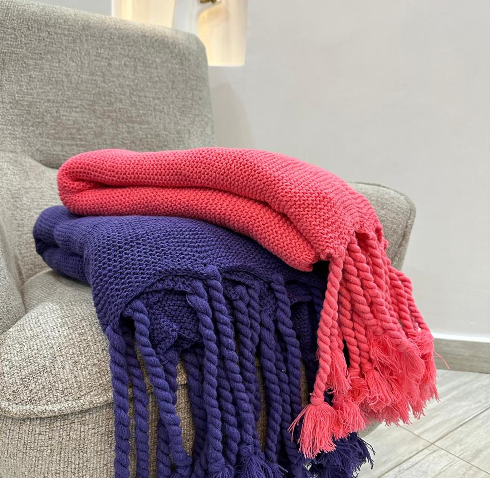 Cozy up with our knitted throw blanket featuring twisted tassels, offering warmth and style with its soft texture and charming design