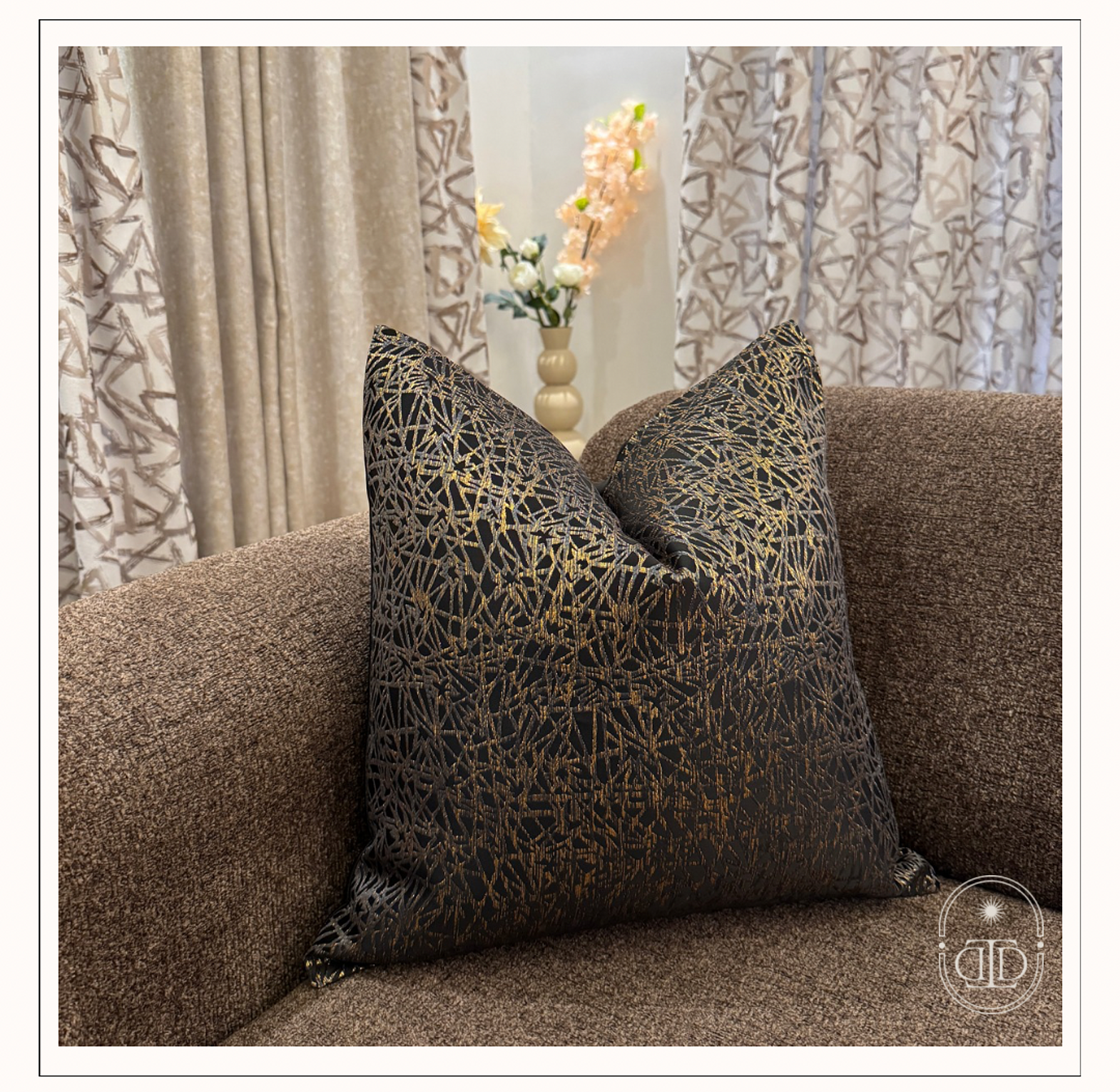 Transform your space with our striking black jacquard cushion cover, featuring a dazzling geometric pattern in silver and gold. Its luxurious sheen and contemporary design make it the perfect statement piece for any modern decor.