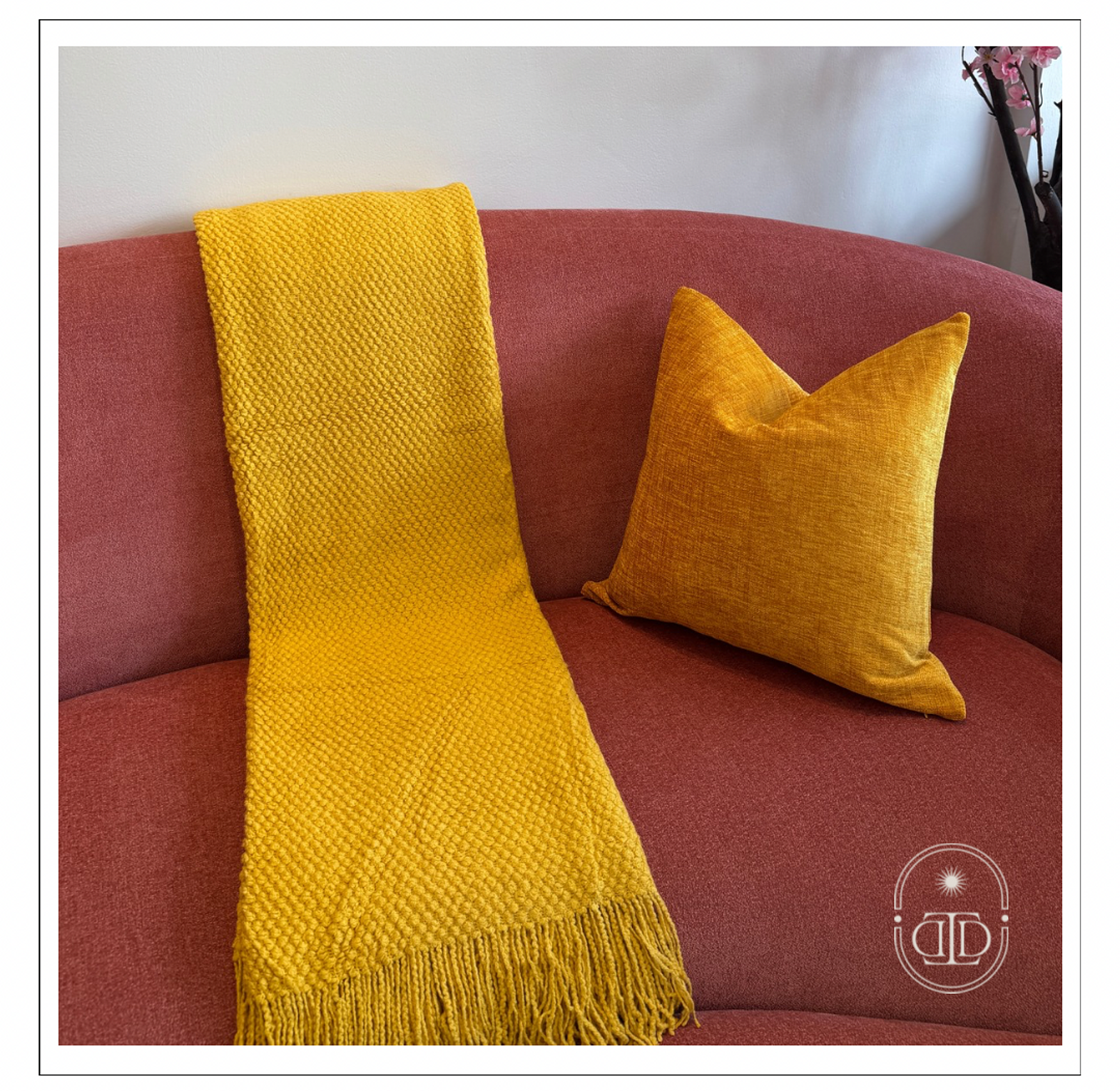 Brighten your space with this mustard yellow throw blanket featuring playful tassels and a cozy textured weave.