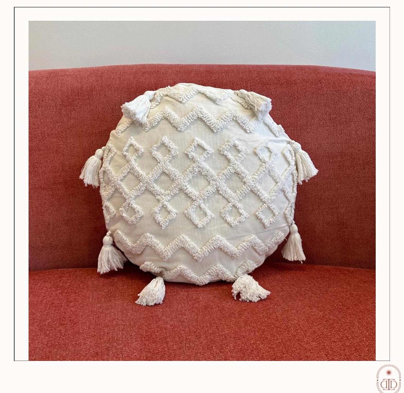 Add a touch of boho-chic elegance to your space with this off-white circular tufted cushion cover, featuring playful pom poms for a cozy and stylish accent.
