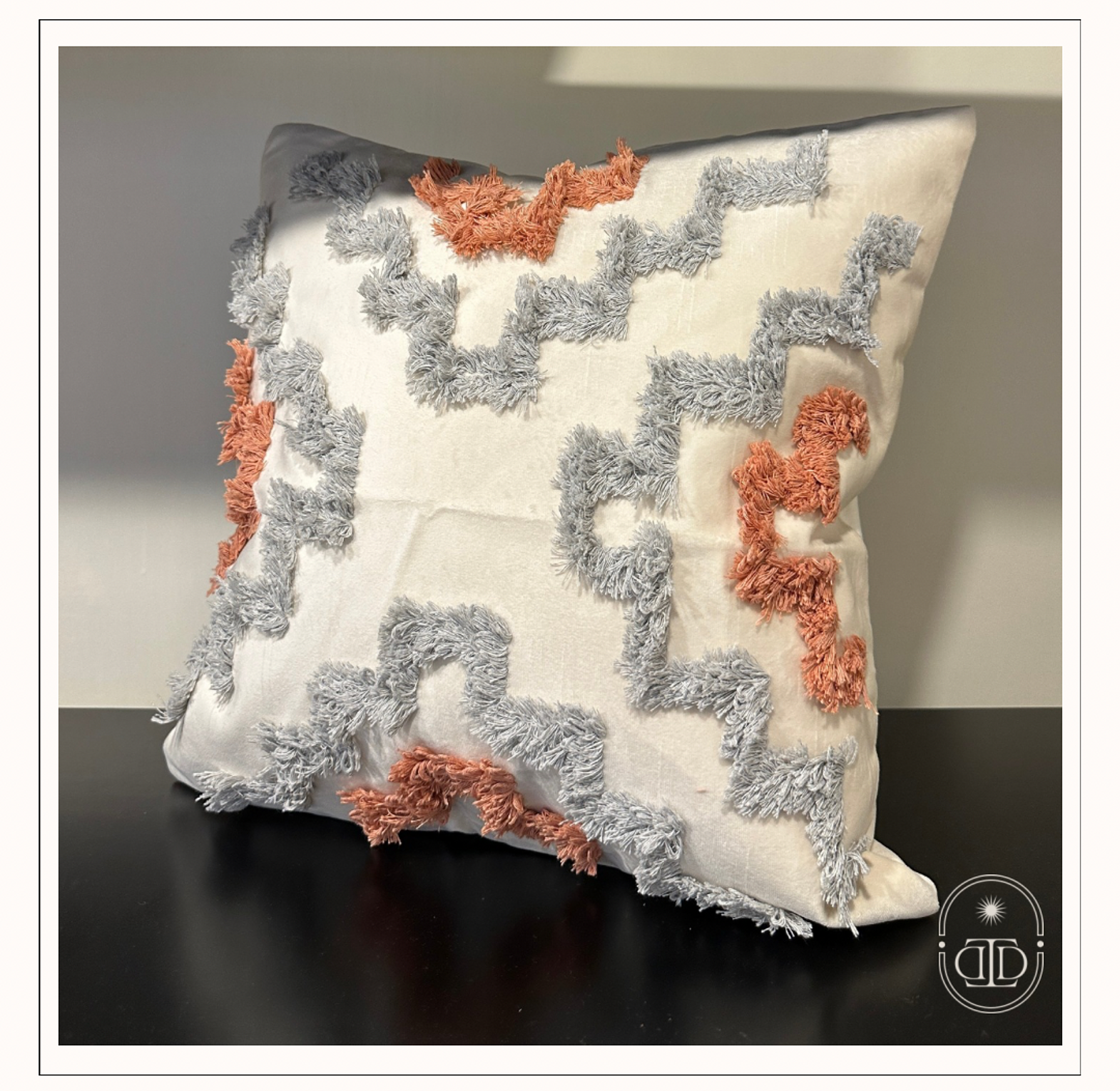 This exquisite off-white velvet cushion cover features a stunning woven pattern in soft grey and delicate pink, adding a touch of elegance and comfort to any space.