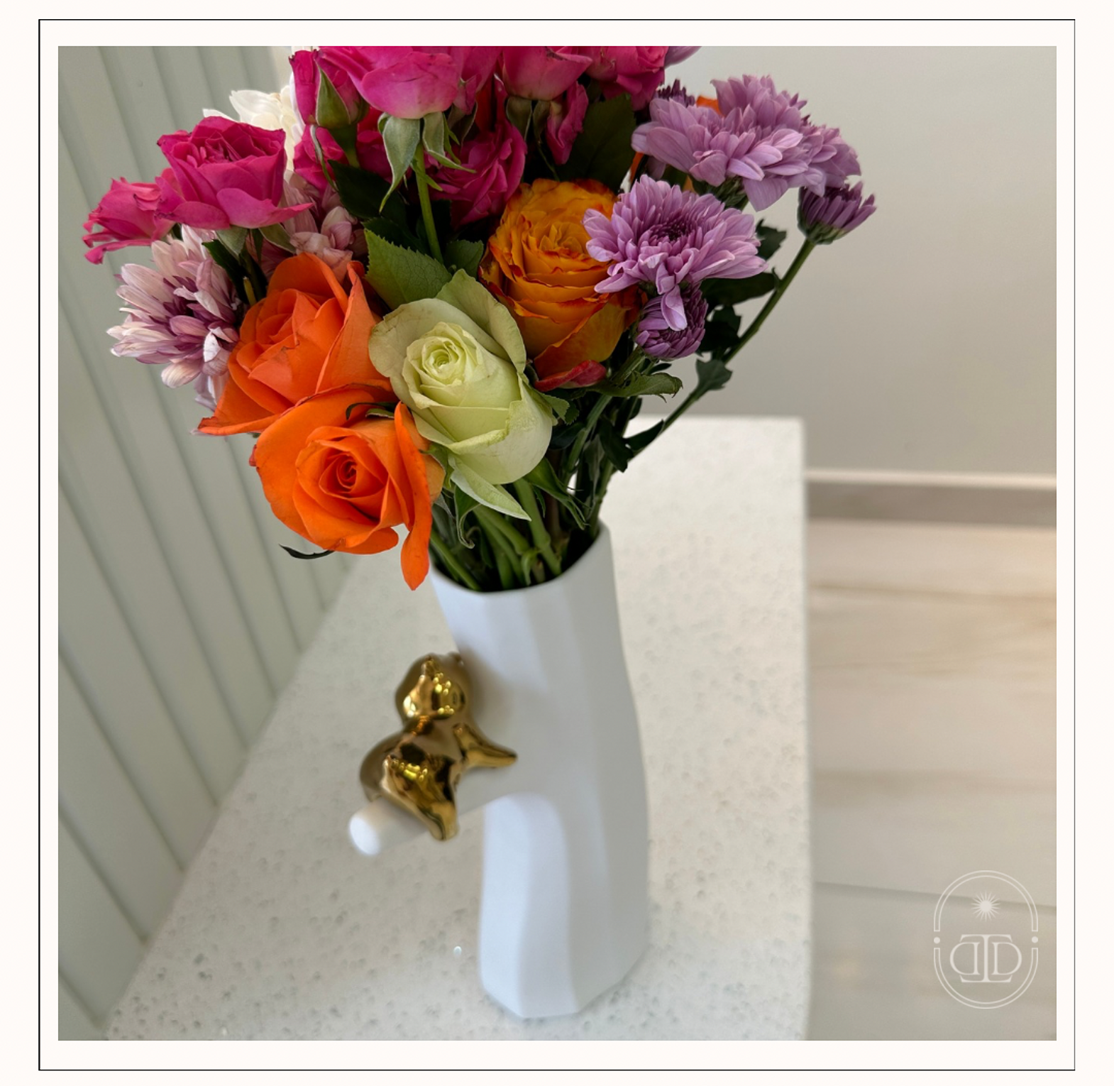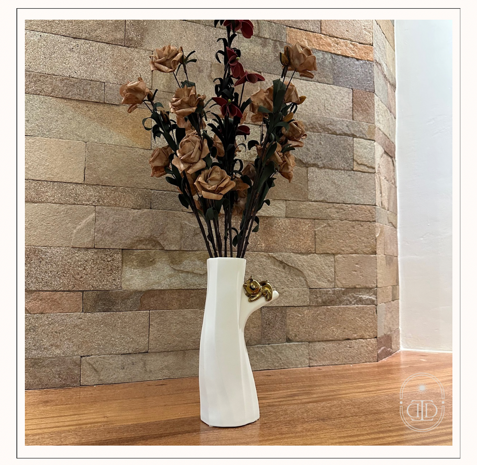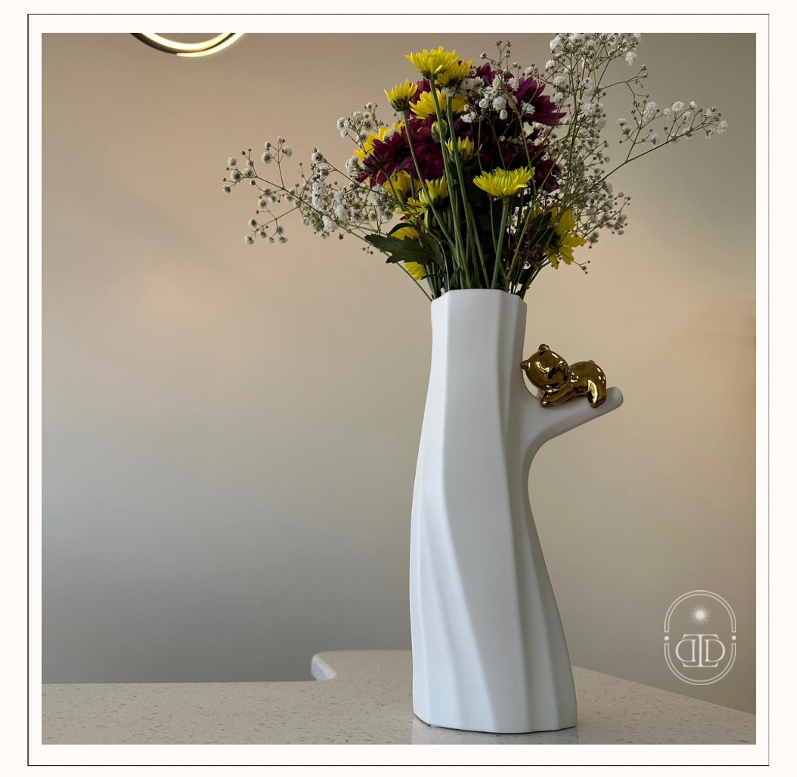 Transform your space with our unique tree stump flower vase, featuring a charming gold bear perched atop for a touch of whimsical elegance.