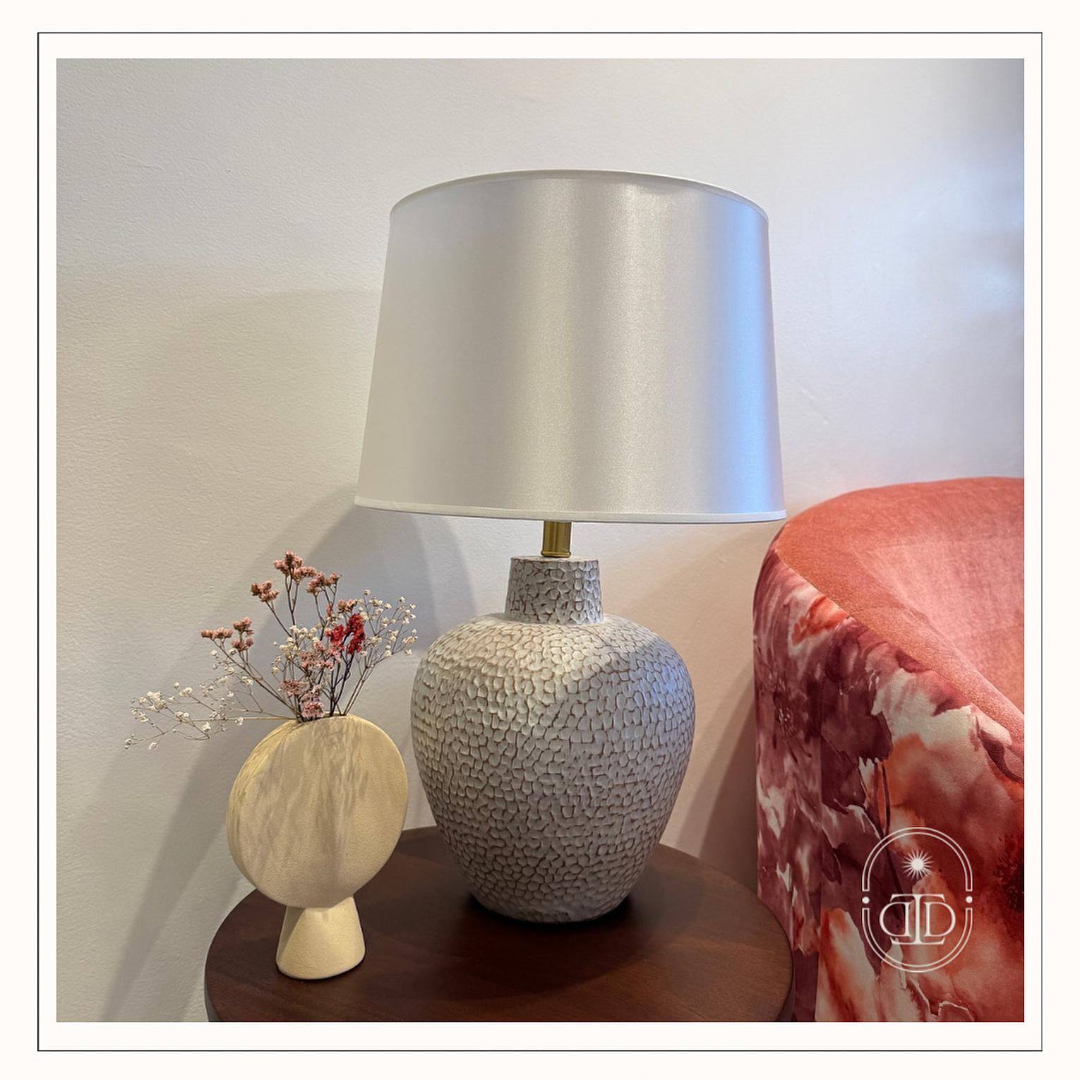 Add a touch of organic charm to your home with this textured resin table lamp. Designed with a softly patterned base and topped with a sleek white shade, it diffuses light beautifully for a calm and inviting glow. Perfect for bedrooms, living rooms, or reading corners, this lamp effortlessly blends modern design with artisanal texture ,an ideal statement piece for those who love timeless decor with a contemporary twist.